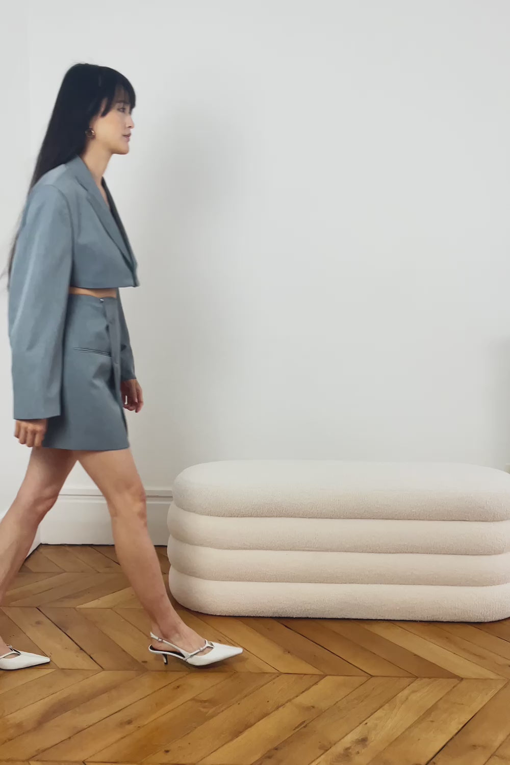 L'Ensemble Tailleur Jupe, en gris bleuté, se compose d'un blazer court et d'une jupe portefeuille taille haute à boutons. La coupe courte du blazer contraste avec la jupe ajustée, soulignant la taille pour créer une silhouette féminine et stylée.